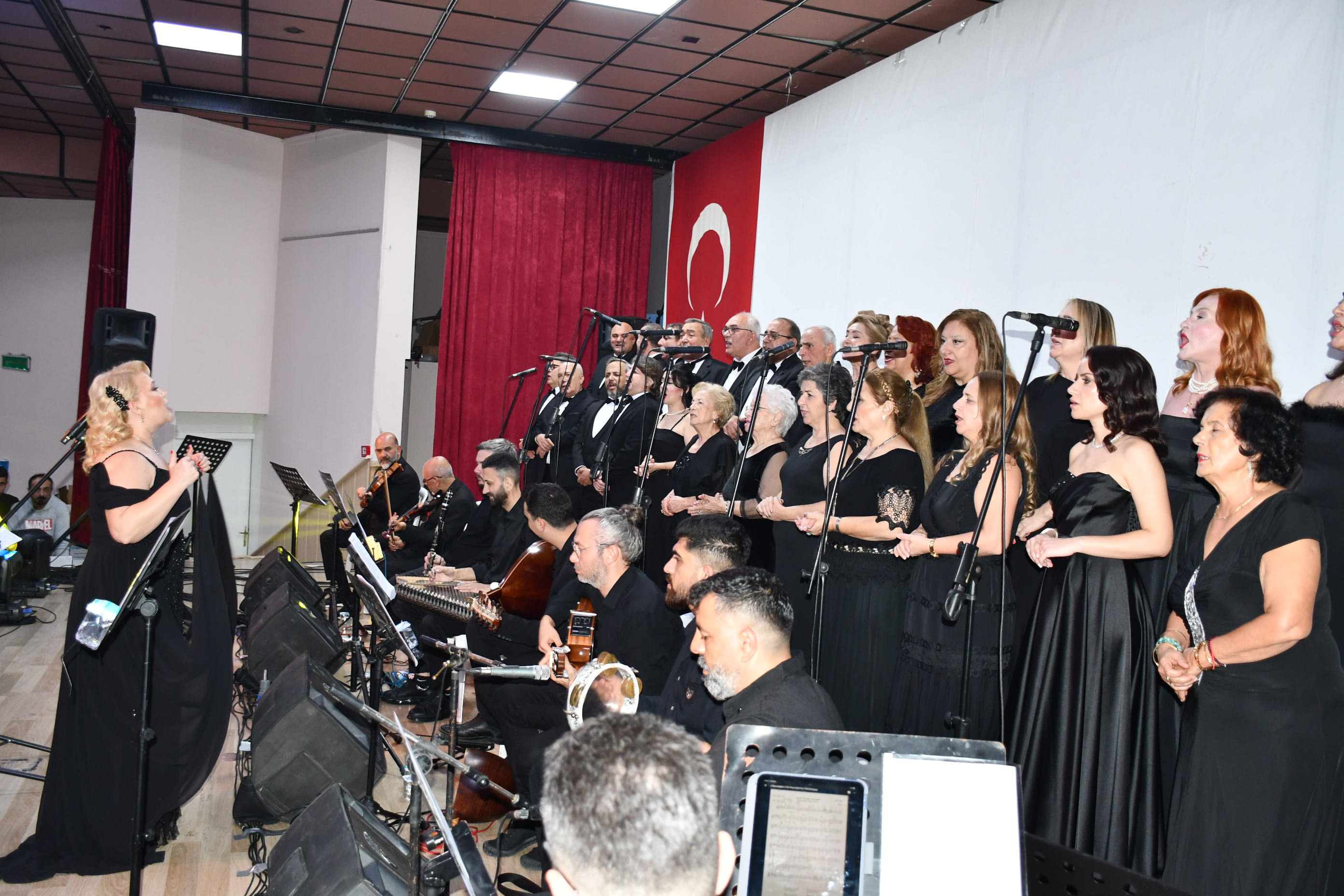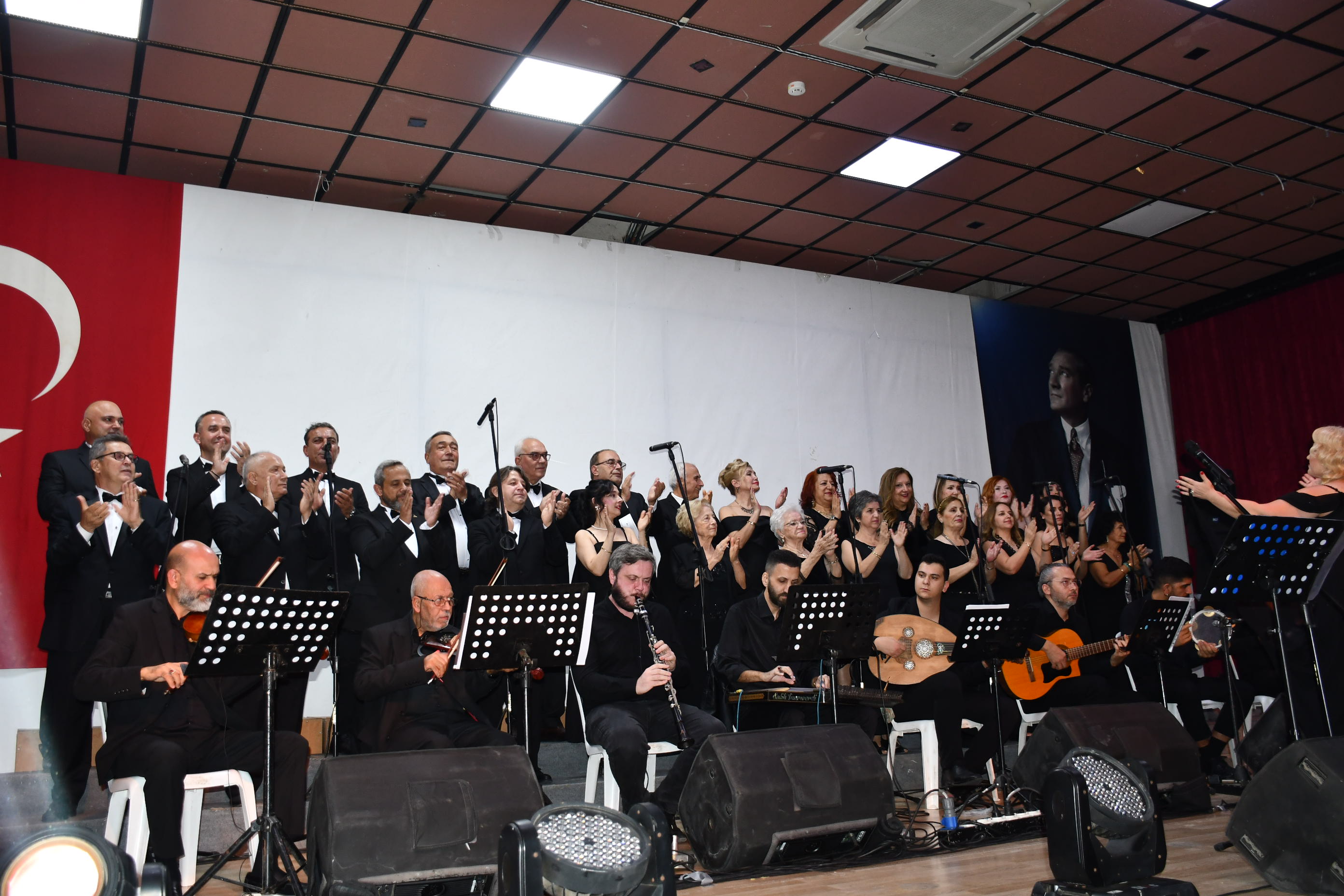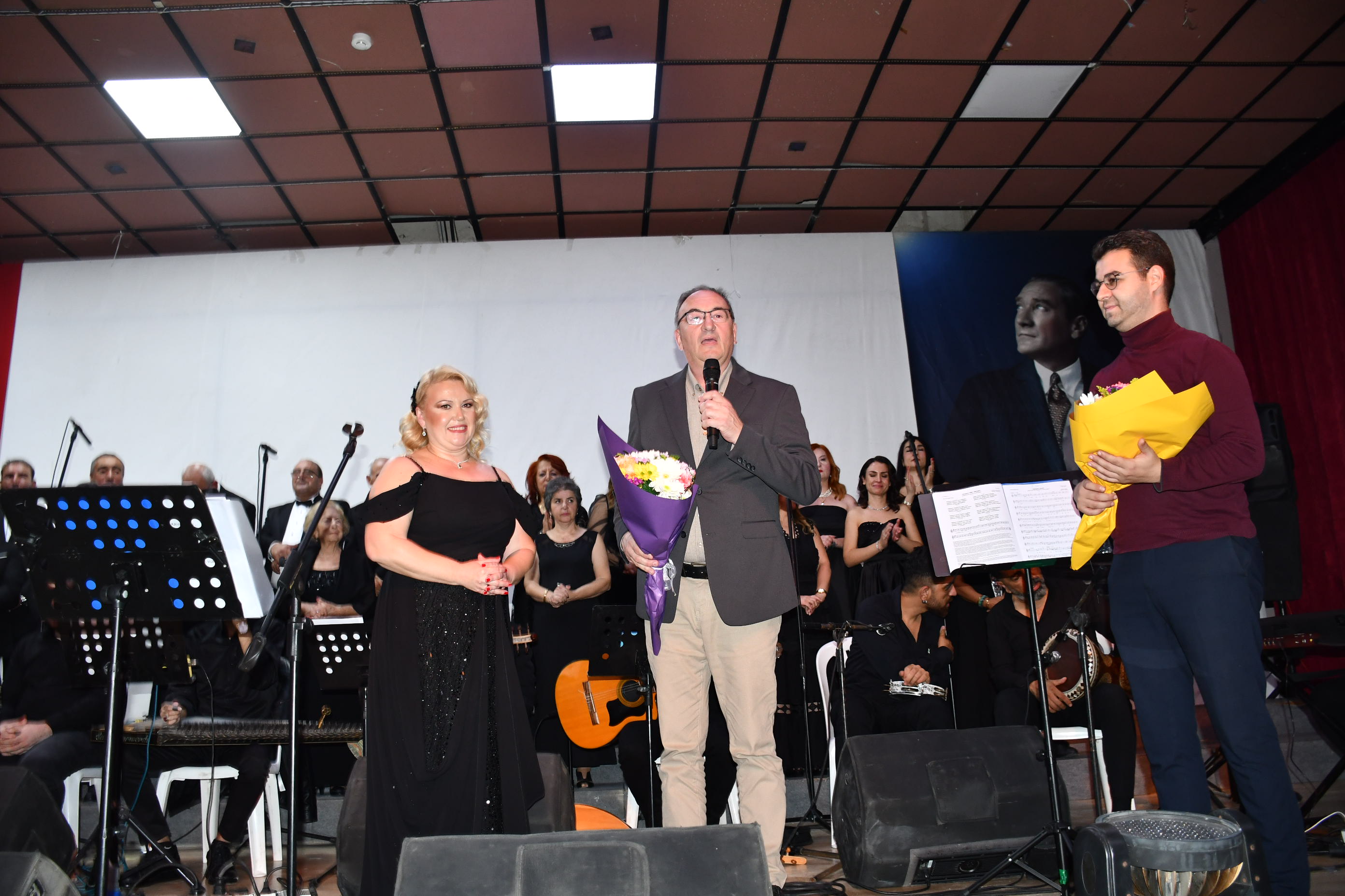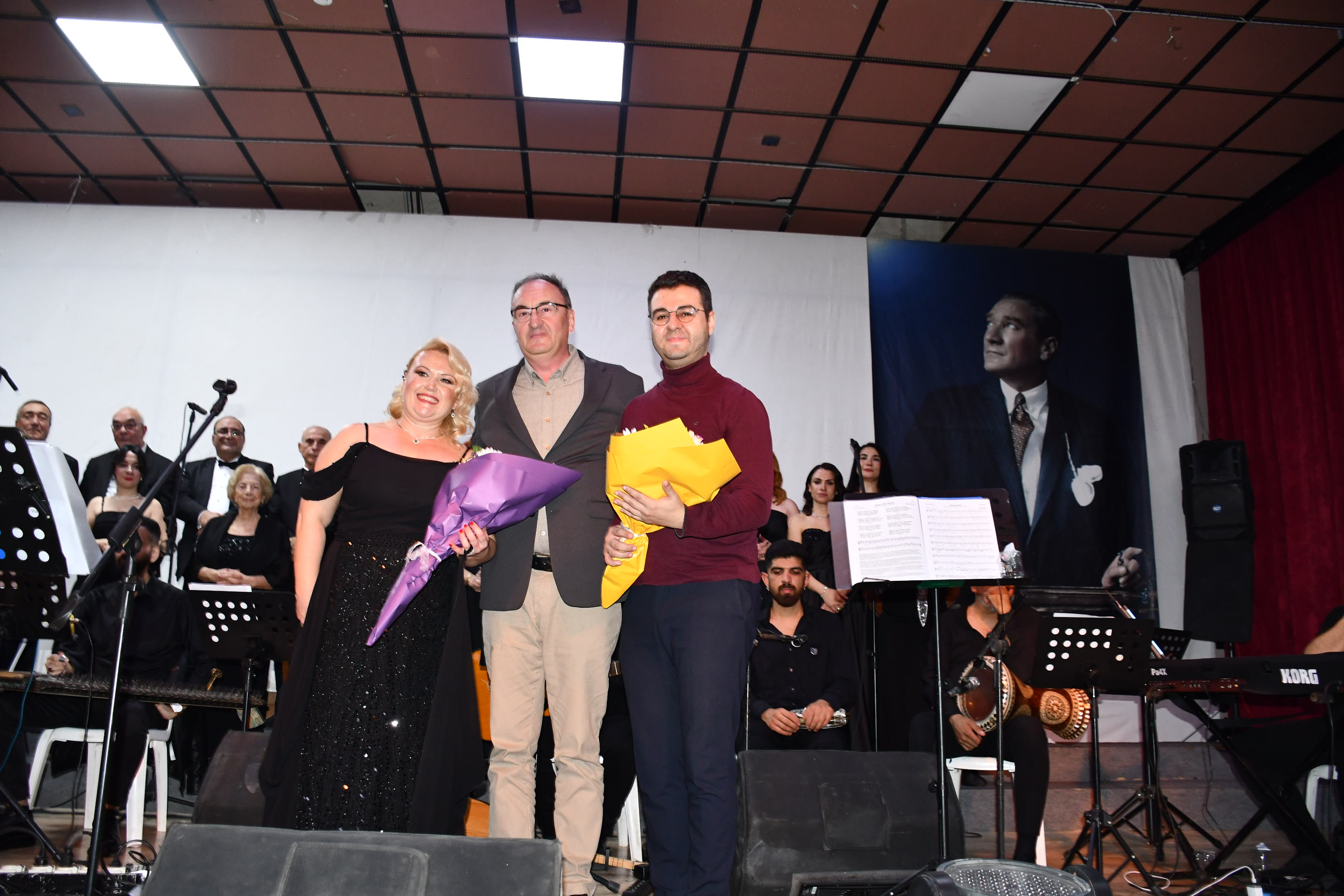 Program sonunda sahneye gelen sanatçılar, Atatürk’ün anısına tüm salonla birlikte “10. Yıl Marşı”nı seslendirerek geceyi coşku içinde noktaladı.