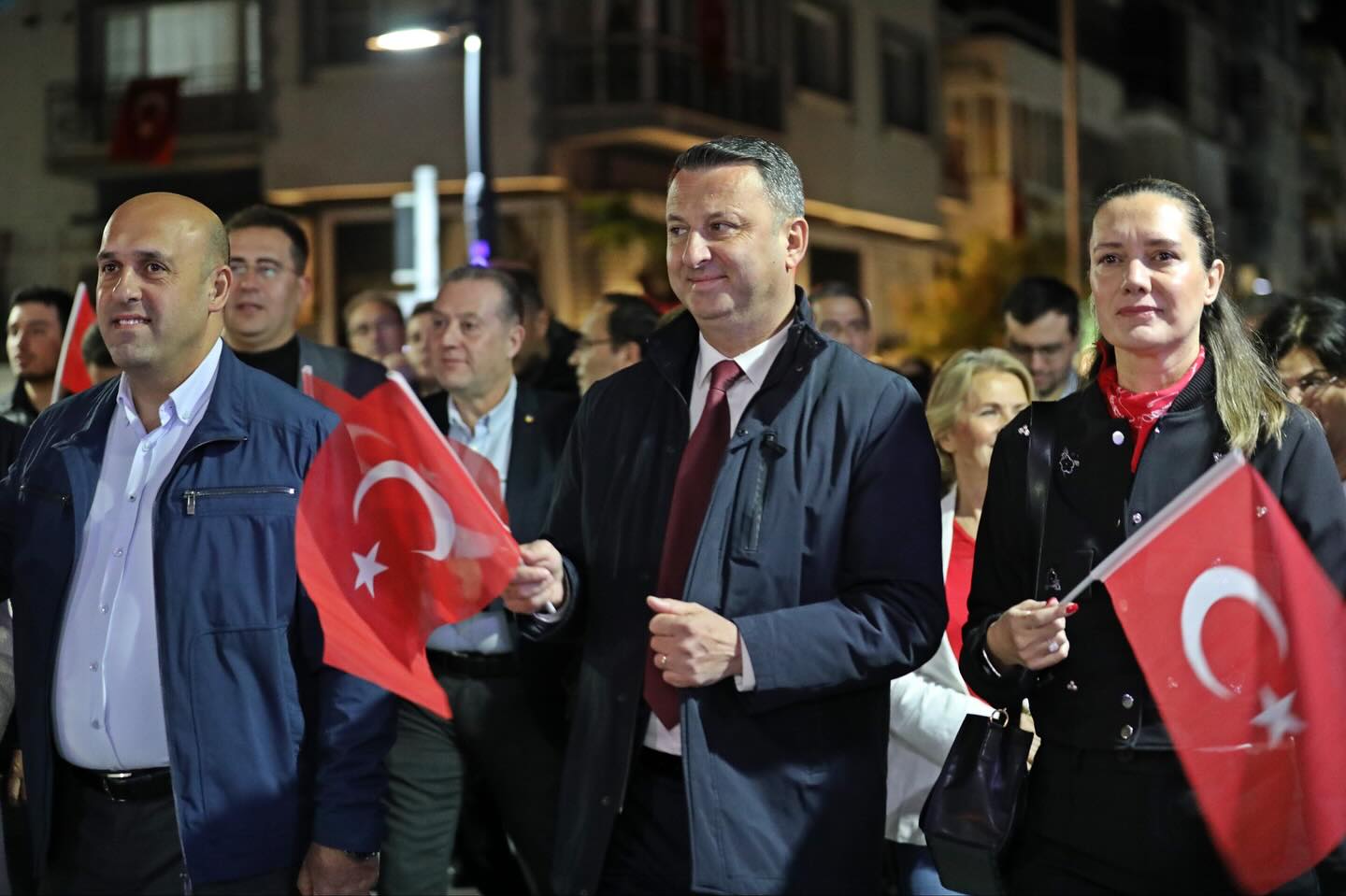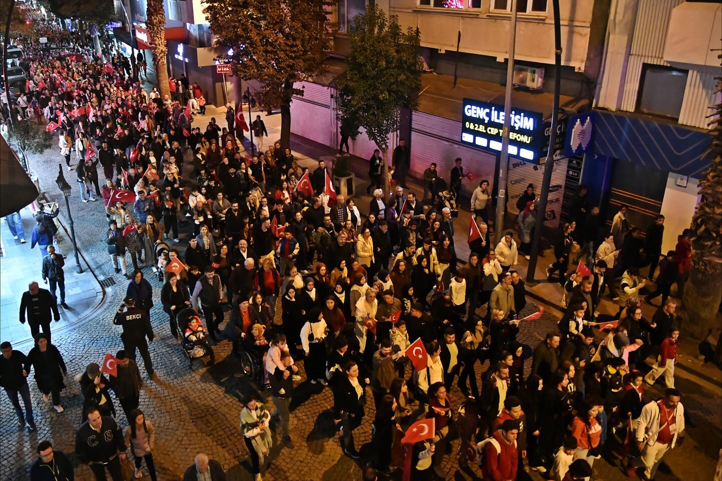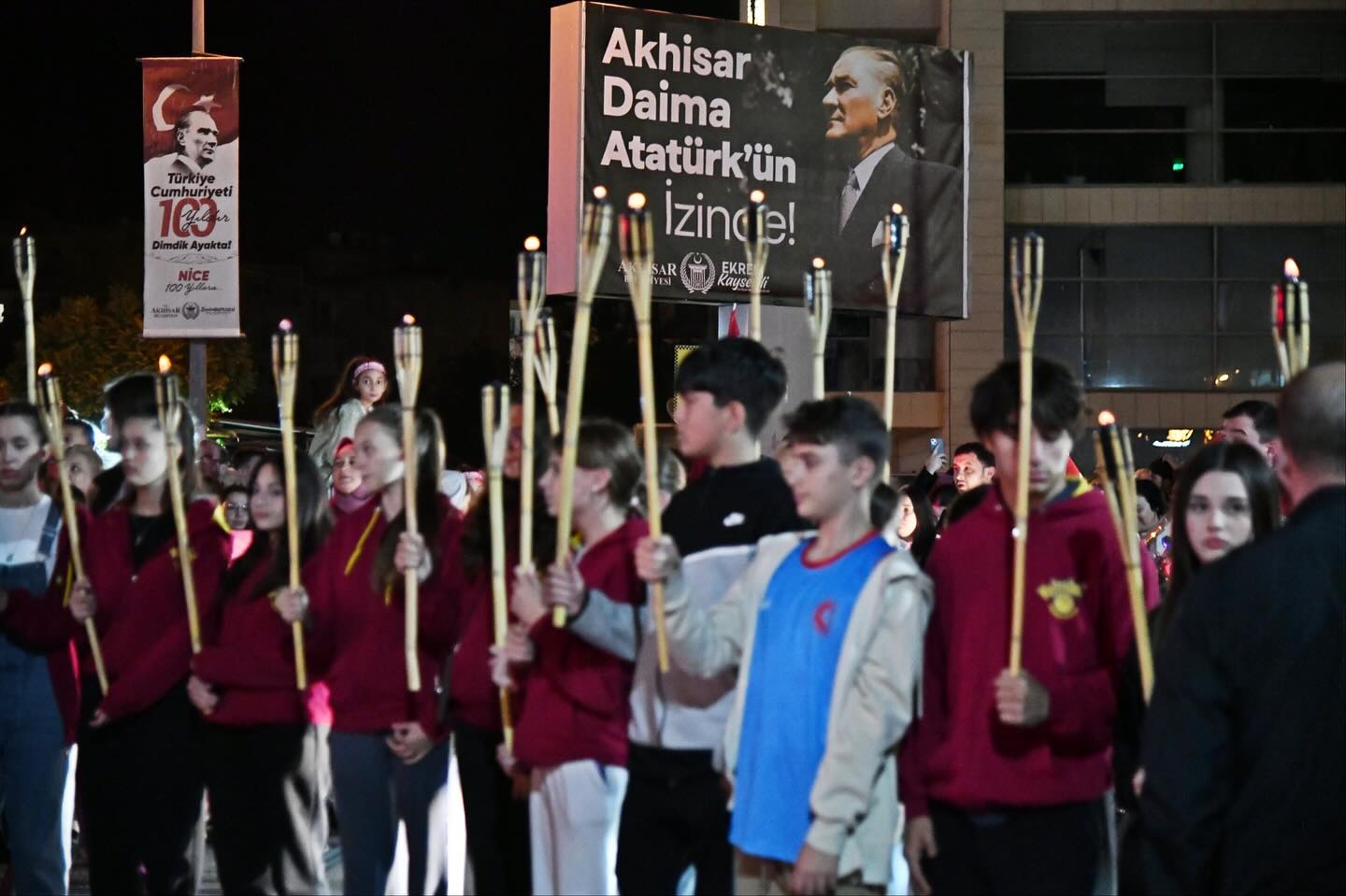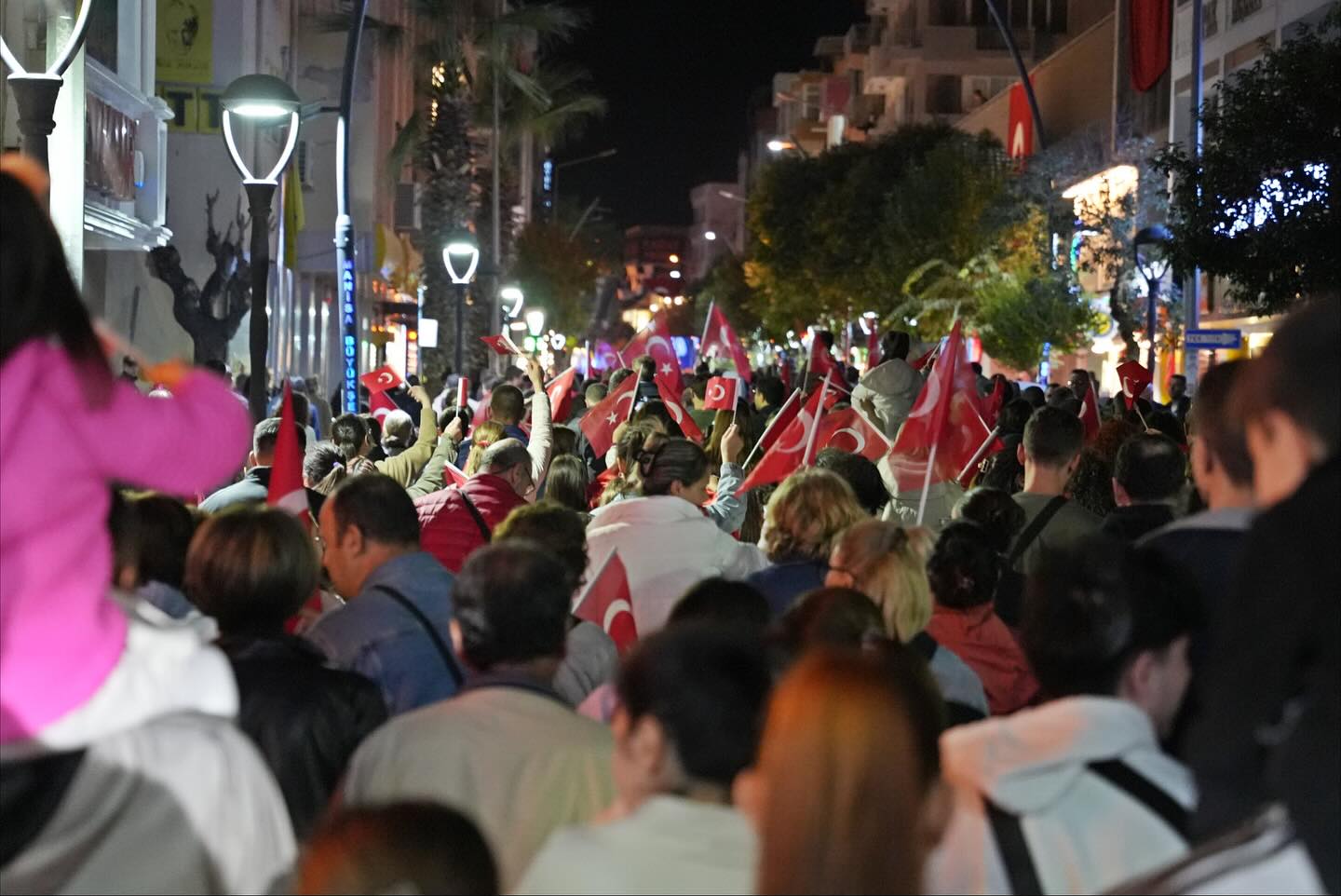 Gün boyu süren etkinliklerin ardından düzenlenen fener alayı, binlerce vatandaşın katılımıyla adeta görsel bir şölene dönüştü. Kentin dört bir yanını kırmızı beyaza boyayan kortejde, marşlar söylendi, meşaleler yakıldı, Cumhuriyet’in kazanımları hep birlikte anıldı.