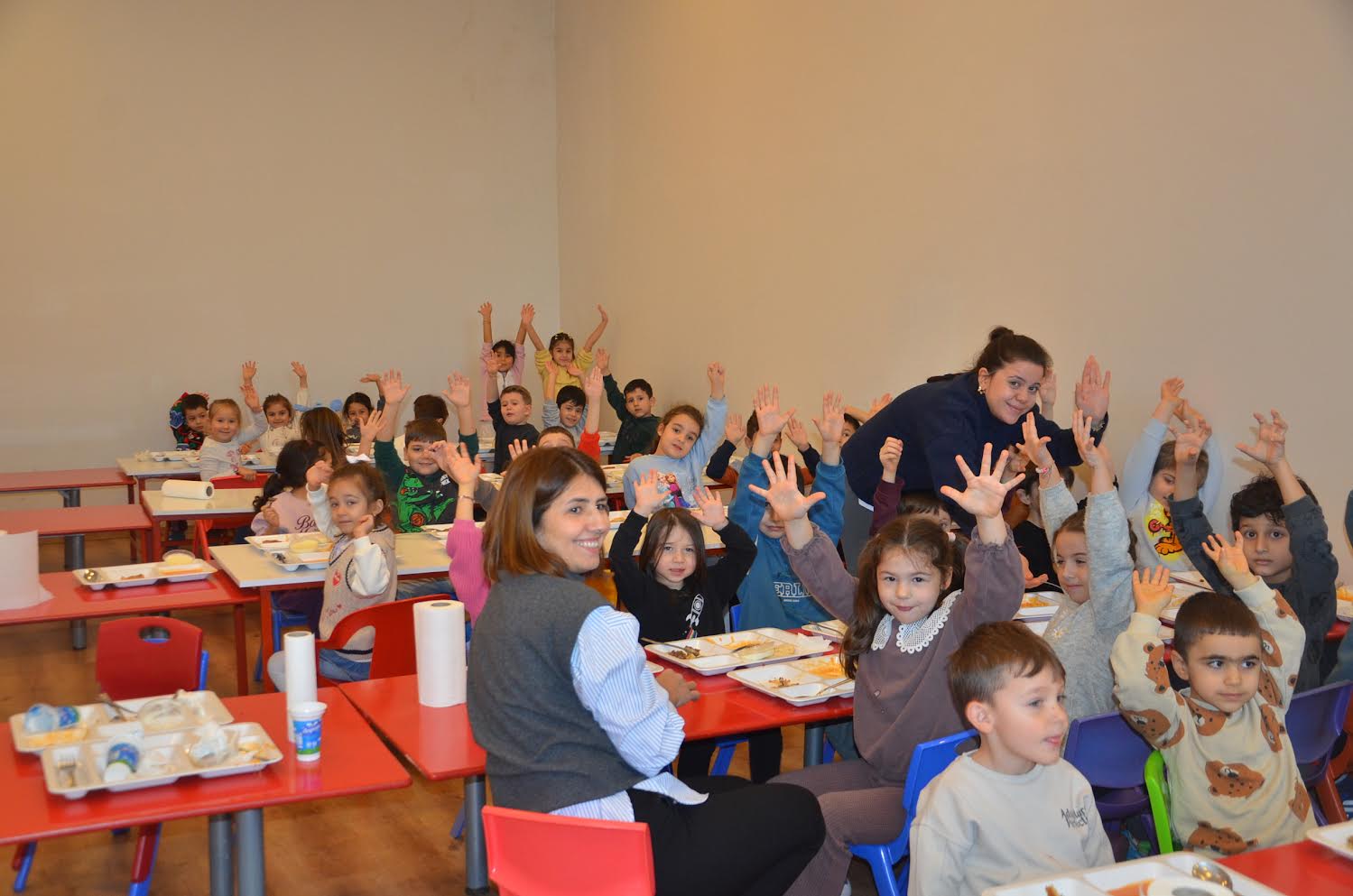 ve 3 personelle 70 minik öğrenci tam gün 7 ayrı sınıfta 10 kişilik sınıflarda eğitimi bazı sınıflarda 2 şer
