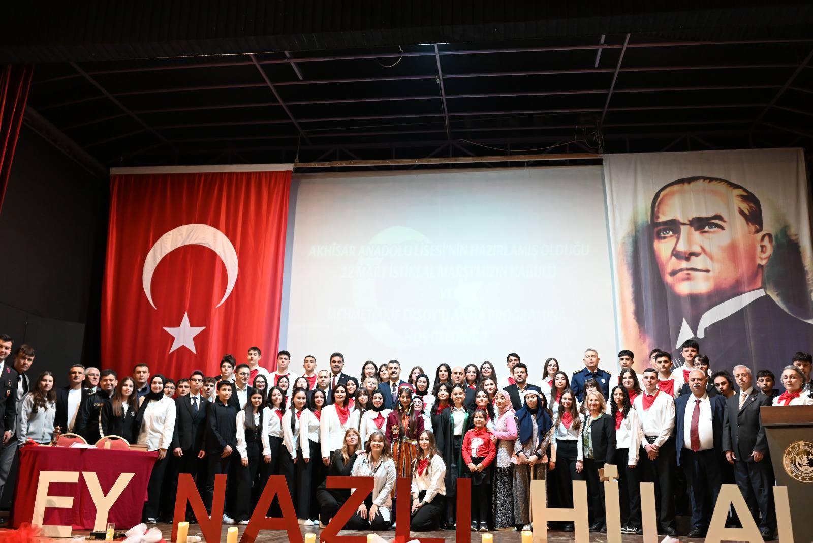 12 Mart İstiklal Marşı’nın Kabulü ve Mehmet Akif Ersoy’u Anma Günü kapsamında Akhisar’da anlamlı bir program düzenlendi. Belediye Park İçi Kültür Salonu’nda gerçekleştirilen programa Akhisar Kaymakamı Mustafa Can, ilçe protokolü, okul müdürleri, öğretmenler ve öğrenciler katıldı.Program, Akhisar Anadolu Lisesi öğretmen ve öğrencileri tarafından hazırlandı. Etkinlikte günün anlam ve önemini belirten konuşmanın ardından öğrenciler tarafından şiirler okundu. Program kapsamında İstiklal Marşı konulu çeşitli yarışmalarda dereceye giren öğrencilere ödülleri protokol üyeleri tarafından takdim edildi.Öğrencilerin hazırladığı oratoryo gösterisi ise katılımcılardan büyük beğeni topladı. Duygusal anların yaşandığı gösteri, izleyiciler tarafından ilgiyle takip edildi.Program, emeği geçen öğretmen ve öğrencilere teşekkür edilmesiyle sona erdi.