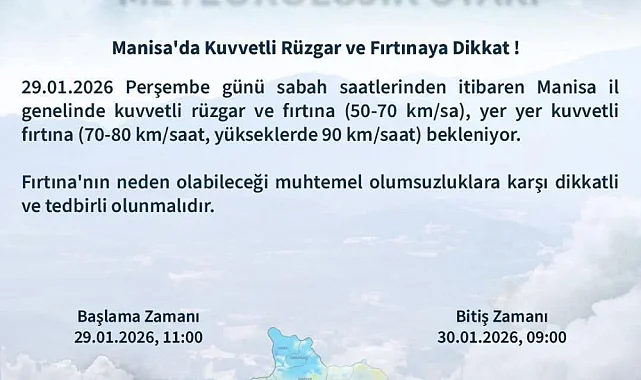 (MHA) Meteoroloji yetkilileri, Manisa genelinde etkili olması beklenen kuvvetli rüzgar ve fırtına nedeniyle vatandaşları dikkatli ve tedbirli olmaları konusunda uyardı. Yapılan değerlendirmelere göre, 29 Ocak 2026 Perşembe günü sabah saatlerinden itibaren il genelinde rüzgarın hızını artıracağı, gün içinde yer yer fırtına şeklinde eseceği bildirildi.
